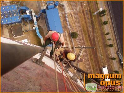 Firma Magnum-Opus specjalizuje się w pracach wykonywanych na wysokości i w trudno dostępnych miejscach. Zastosowanie technik alpinistycznych pozwala zrezygnować z ciężkiego sprzętu, podnośników, rusztowań. Dzięki temu czas potrzebny na wykonanie zadania jest zdecydowanie krótszy.